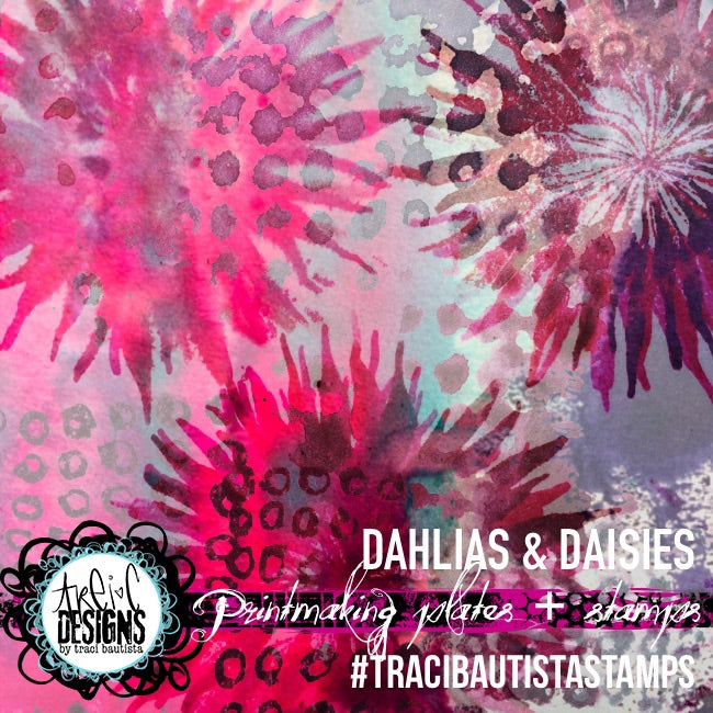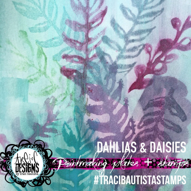 Create colorful abstract mixed media backgrounds with Traci Bautista’s latest artist stamp PRINTS + FLORALS collection.
