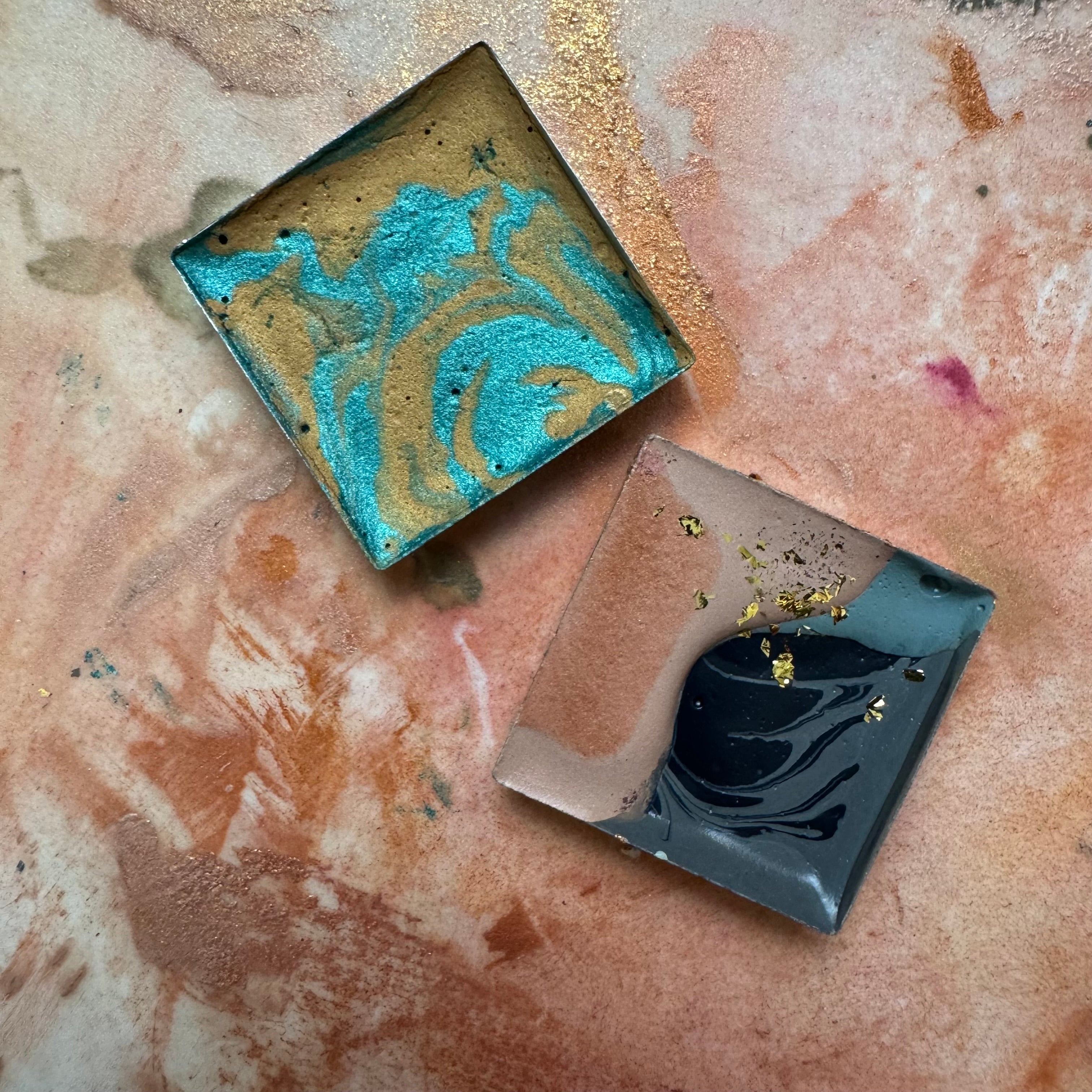 • 2 Multicolor Watercolor Pans: Beautifully handcrafted watercolor pans that have 3-4 colors in each pan, made with artist grade pigments and homemade organic binder topped with metallic flakes