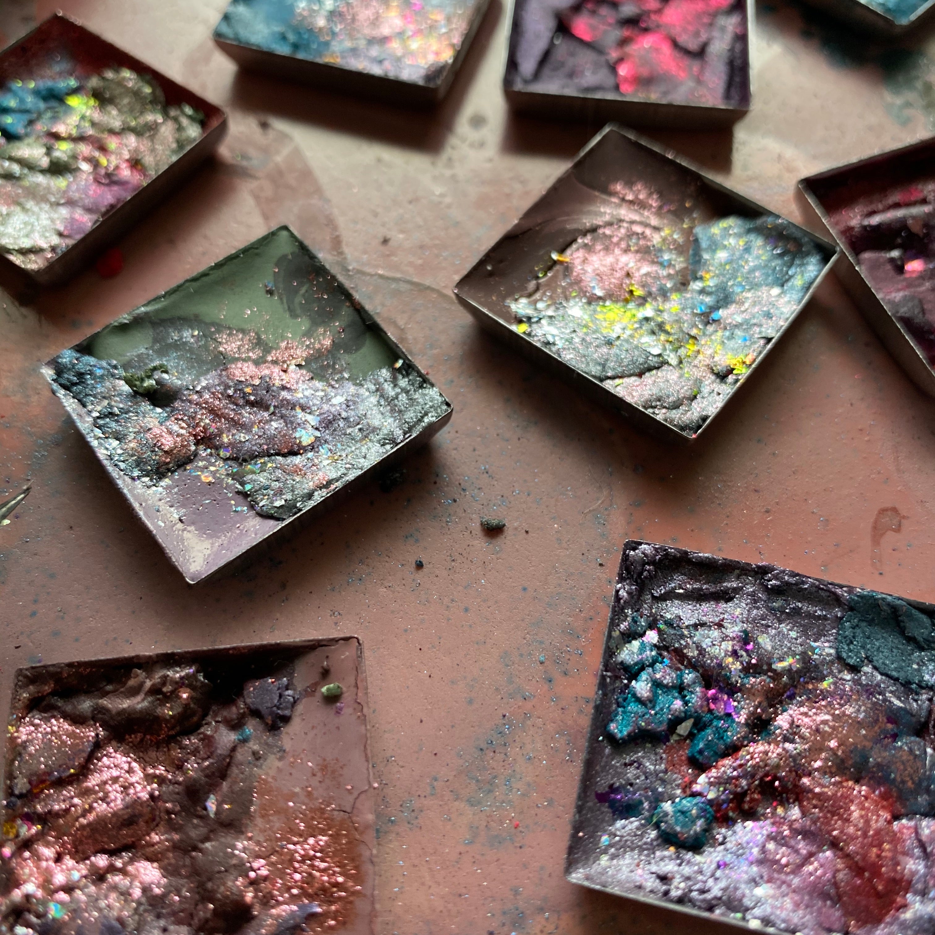 CRYSTALS & GEODES collection: whispering hues of metallic jade, turquoise shimmer, 24K, lilac frost, earthy Australian ochre, gunmetal metallic, golden rust and hints of midnight blue or berry pop and they have a bit of additional metallic flakes. Each half pan is one-of-a-kind. You will receive 2 different multi-color pans that will be similar to those in the product photos.