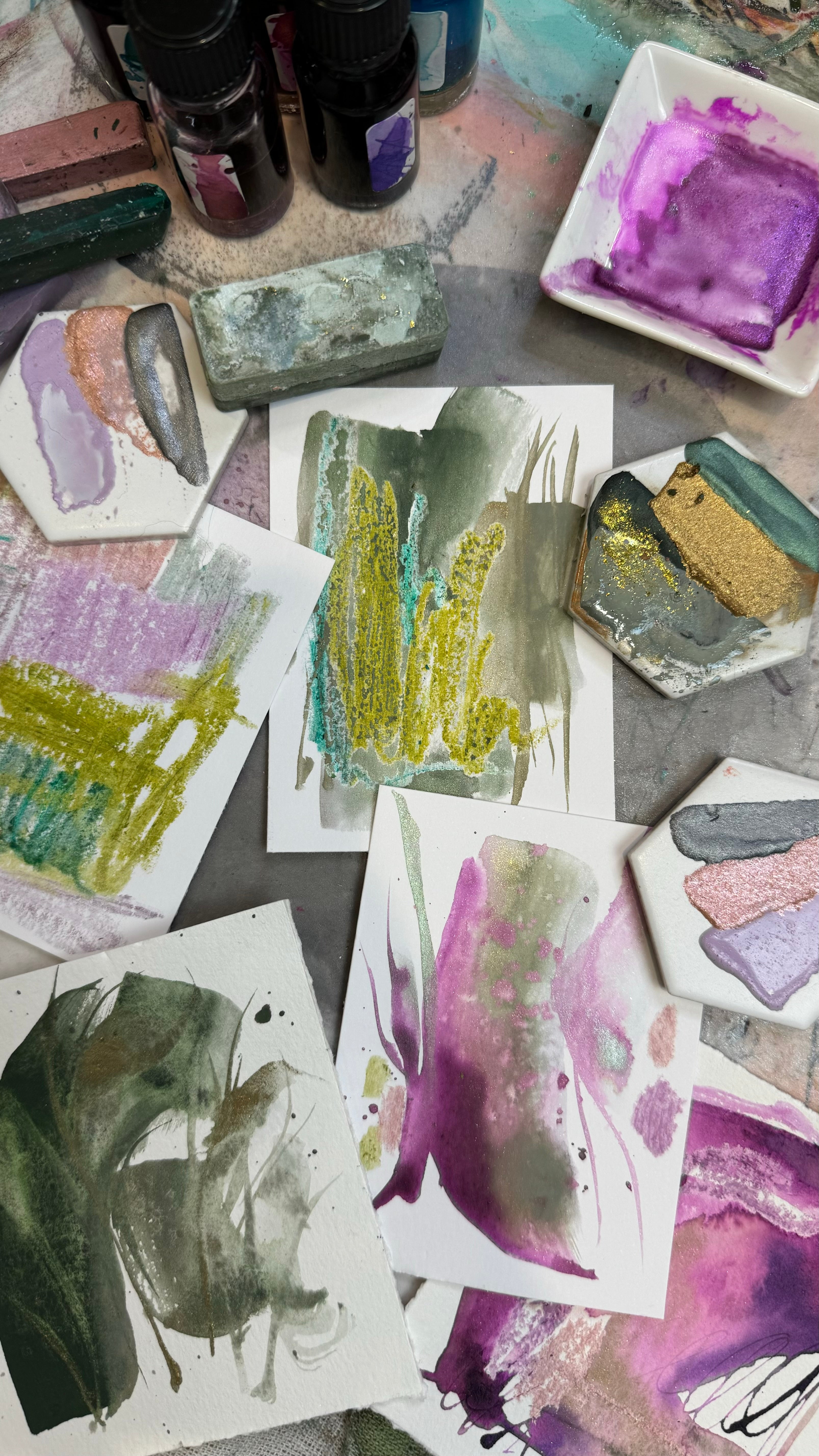 The entire handcrafted artisanal mixed media collection creates a beautiful range of colors when they are mixed and layered 🎨 Some paints have a bit of additional metallic flakes while others are marbled with layers of colors.