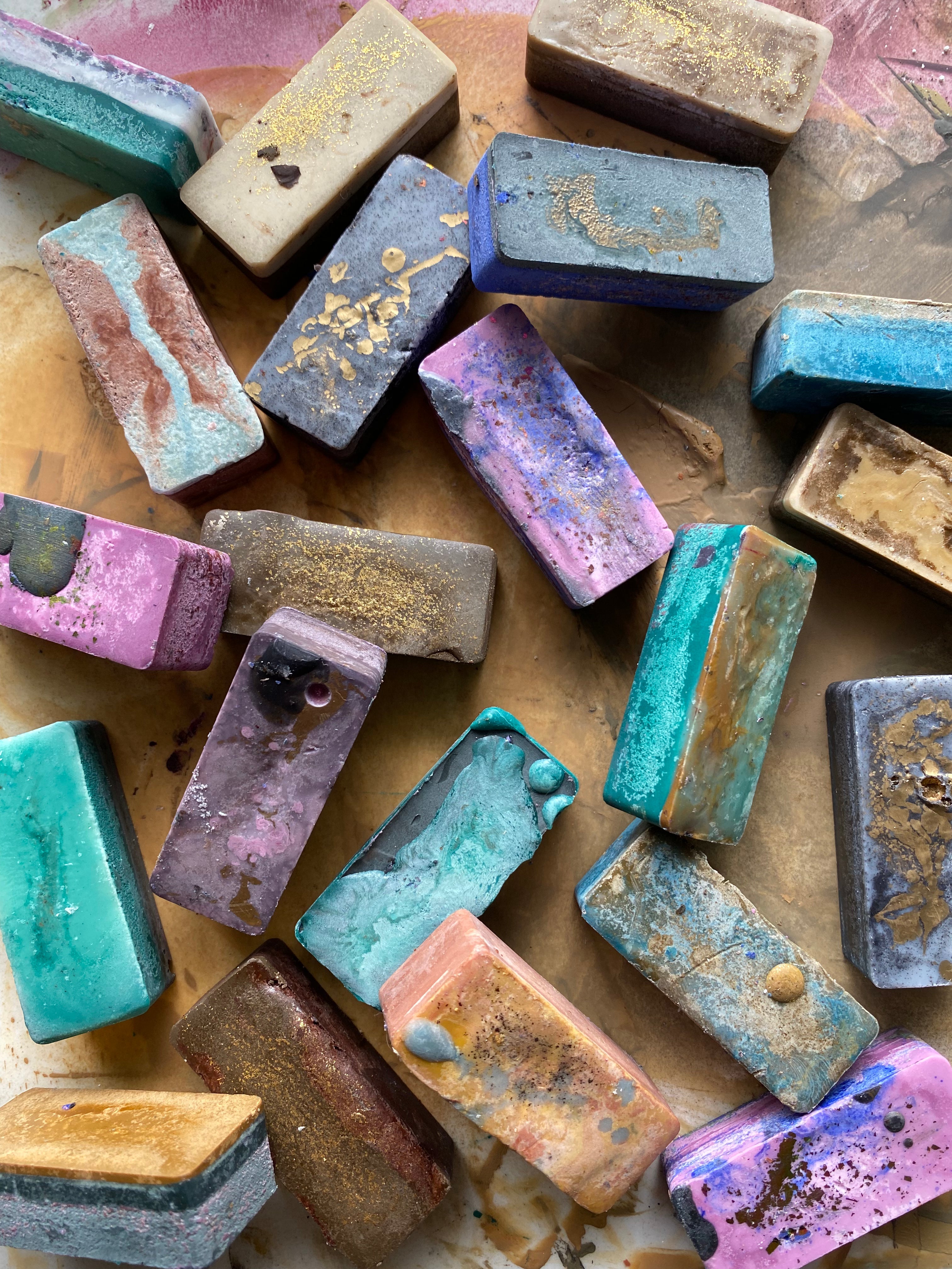 SPRING COLOR PALETTE: {this is a mystery box} The collection is a gorgeous mix SPRING inspired colors. Each bar is duotone, meaning it has 2-3 colors. They create a beautiful color range when you blend them together or mix them with inks & paints🎨 Some pigment bars have a bit of additional metallic flakes while others are marbled with layers of colors.